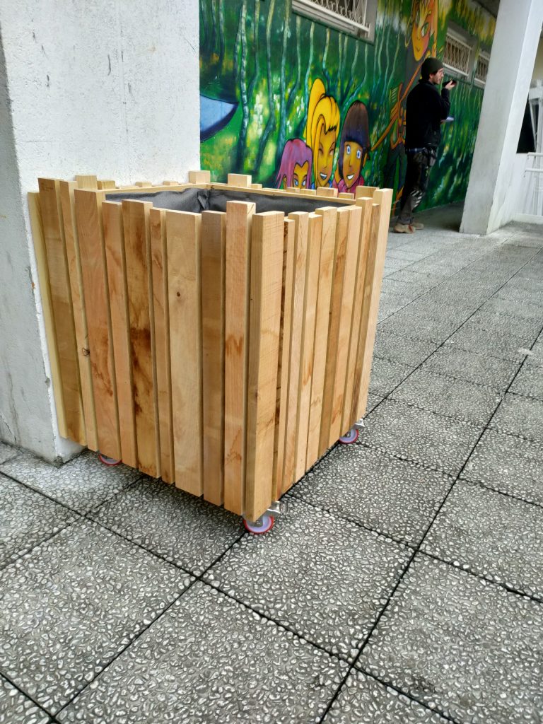 L’agencement est en contreplaqué peuplier et medium de réemploi. La table de cuisine est faite avec un plan de travail fourni par la cliente et assorti avec la cuisine existante. Les finitions sont faites à la peinture naturelle blanche et les chants du CP visibles protégés à l’huile dure environnement. L’arrière de l’assise est habillée par les briques en textile recyclé de Fabbrik.