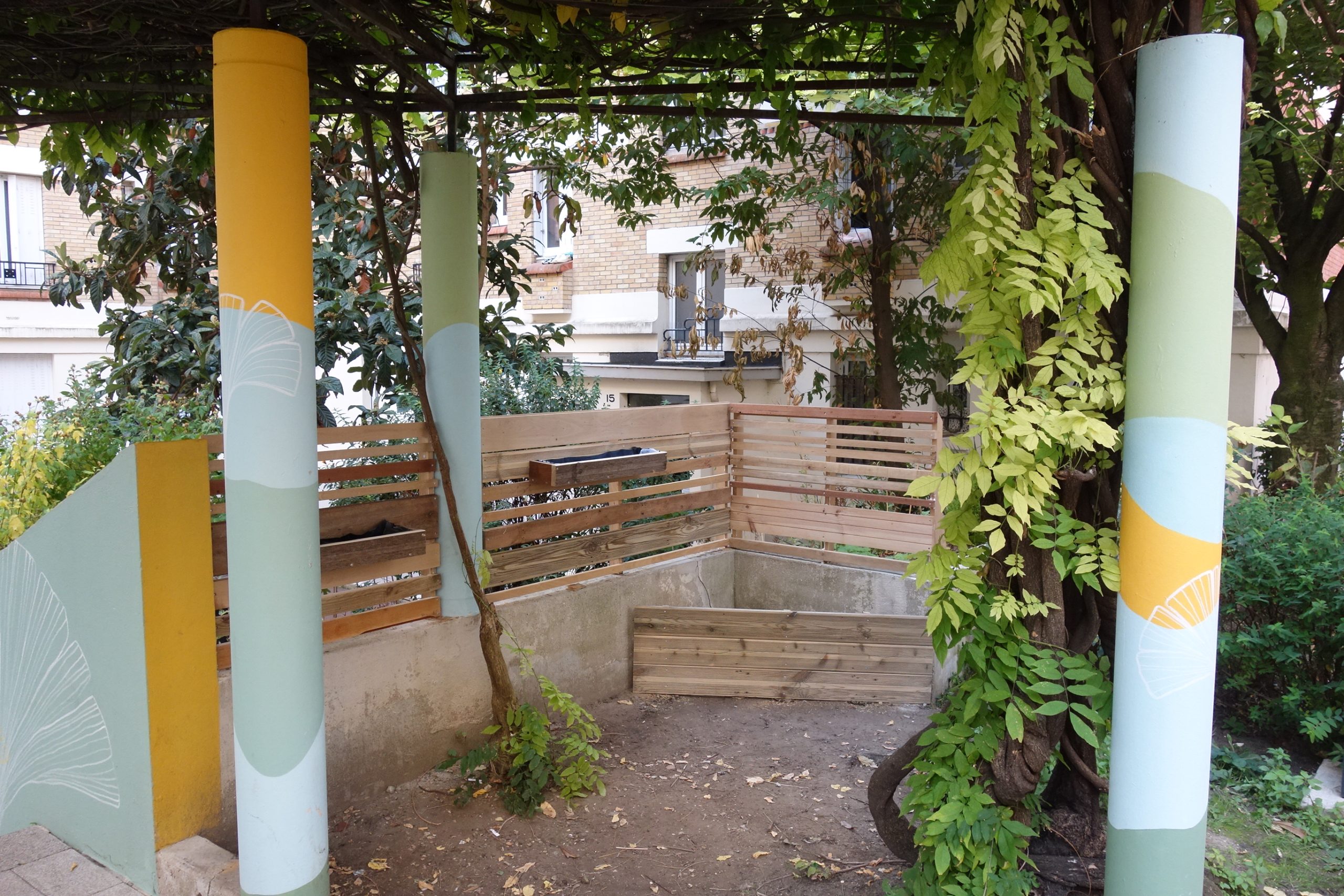 A la fin de l’été nous avons réalisé l’aménagement d’un angle dans une belle résidence de la RIVP. La demande était d’exploiter cette espace avec une structure très minimaliste, en bois de réemploi résistant à l’eau (classe 4) et intégrant des espaces pour des futurs jardinières.